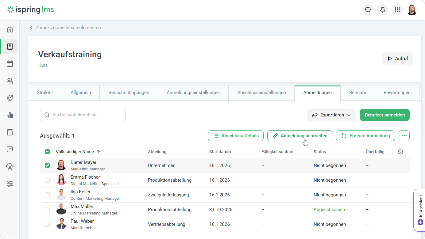 - Öffnen Sie einen Kurs, gehen Sie zur Registerkarte Anmeldungen, wählen Sie einen oder mehrere Benutzer aus und klicken Sie auf Anmeldung bearbeiten.