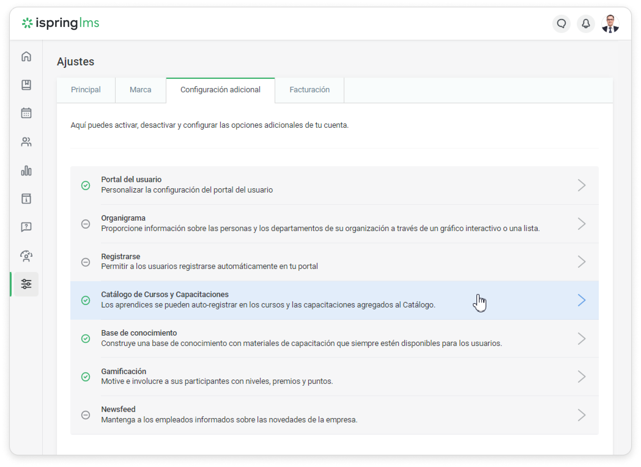 1. Abre la pestaña Configuración adicional y haz clic en Catálogo de Cursos y Capacitaciones.