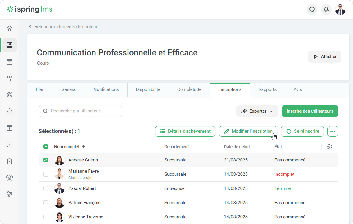 - Ouvrez le cours, rendez-vous sur l’onglet Inscriptions, sélectionnez un ou plusieurs utilisateurs, et cliquez sur Modifier l'inscription.