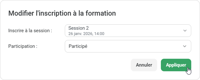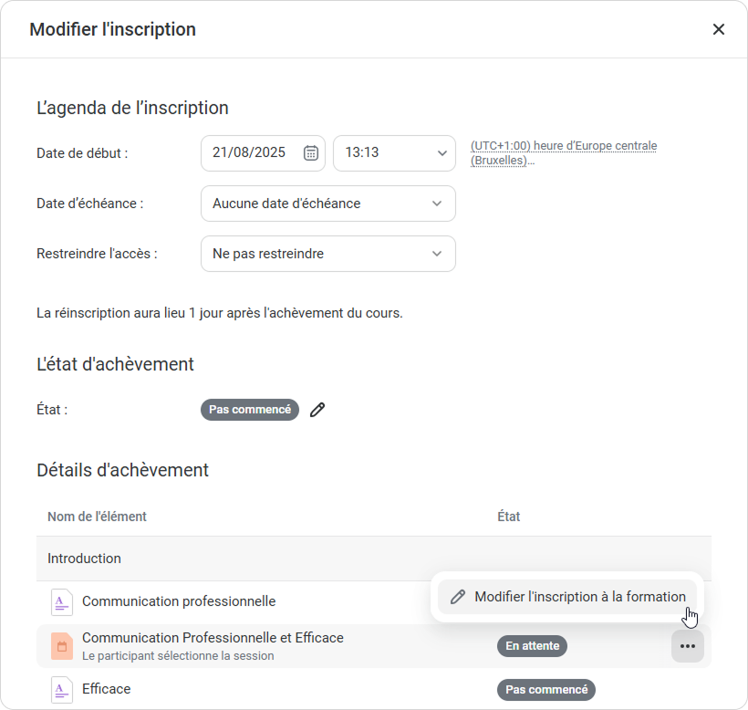 - La modification de l'inscription à une formation incluse dans un cours est disponible pour les utilisateurs ayant le droit de modifier les cours.