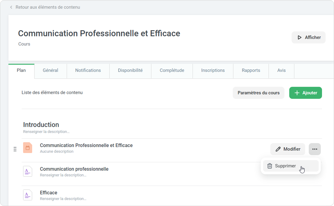 - Si vous supprimez une formation d'un cours, elle ne sera supprimée que de ce cours. La formation autonome sera conservée dans le compte.