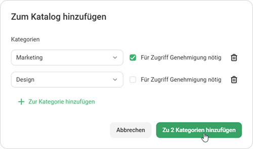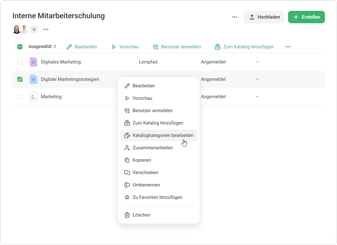 Schulungsleiter können mehrere Katalogkategorien zu einem Kurs hinzufügen. Das bedeutet, dass Mitarbeiter aus verschiedenen Abteilungen und Teams die benötigte Schulung leicht finden können.