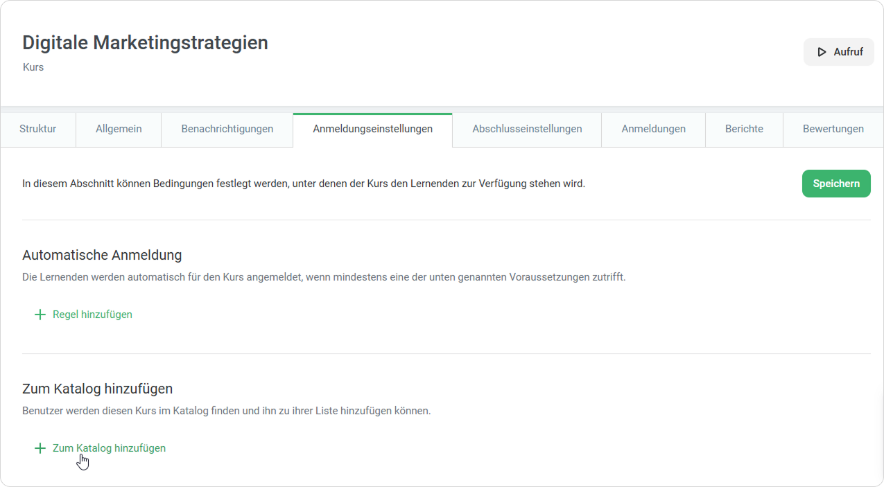 So fügen Sie einen Kurs in der Registerkarte "Anmeldungseinstellungen" zu einem Katalog hinzu