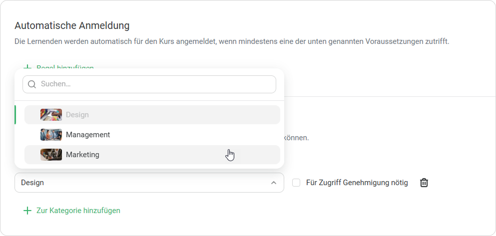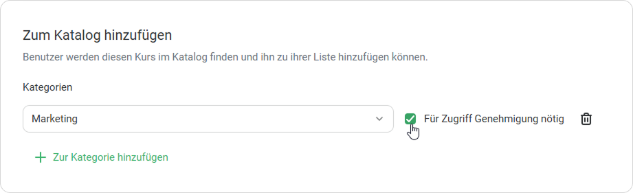 2. Wählen Sie eine Kategorie aus und geben Sie an, ob Benutzer sich für den Kurs bewerben müssen.