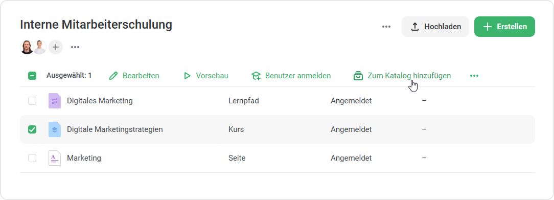 1. Wählen Sie in der Liste der Kurse den Inhalt aus und klicken Sie auf Zum Katalog hinzufügen.