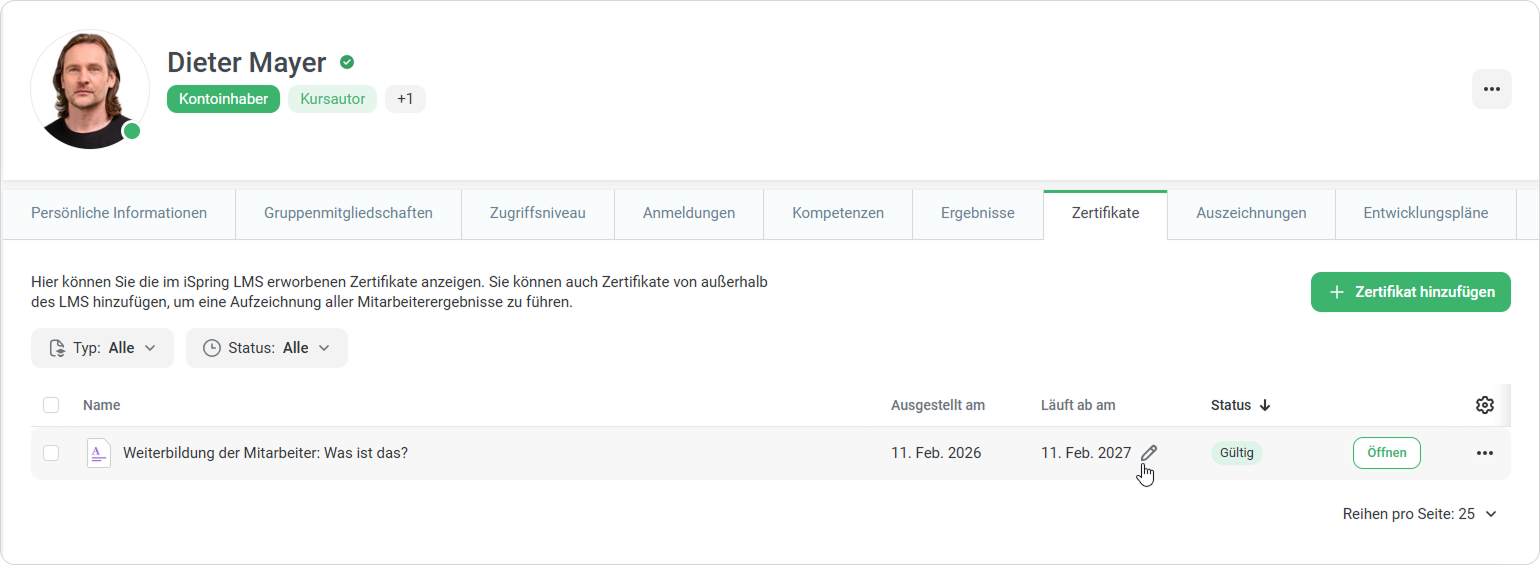 Der Kontoinhaber und der Administrator können in das Profil des Mitarbeiters gehen und das Datum ändern, an dem das aktuelle Zertifikat in der Registerkarte Ergebnisse des Lernenden ablaufen soll. Abteilungs-Administratoren und benutzerdefinierte Rollen können dies nur für Benutzer in ihrem Sichtbereich tun.
