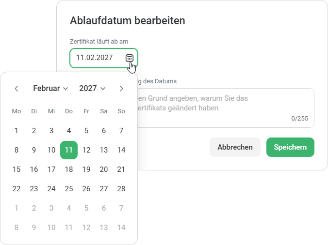 4. Wählen Sie im Fenster Ablaufdatum bearbeiten einen neuen Gültigkeitszeitraum im Kalender für das Zertifikat aus.