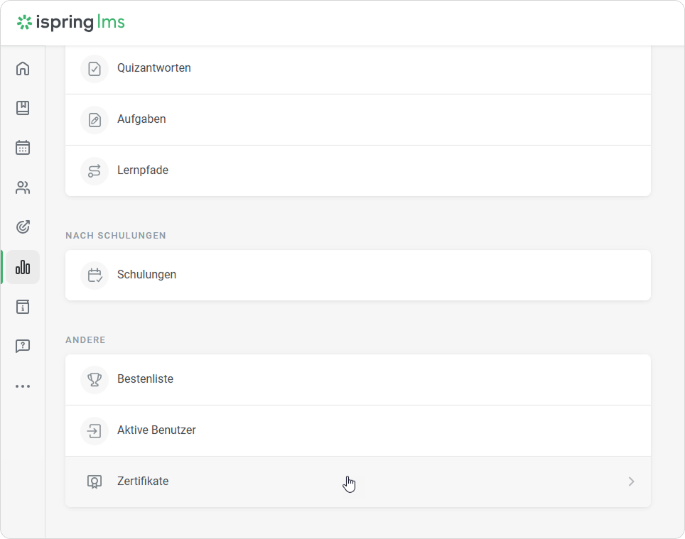 1. Gehen Sie in der Registerkarte Berichte zu Andere und wählen Sie Zertifikate.