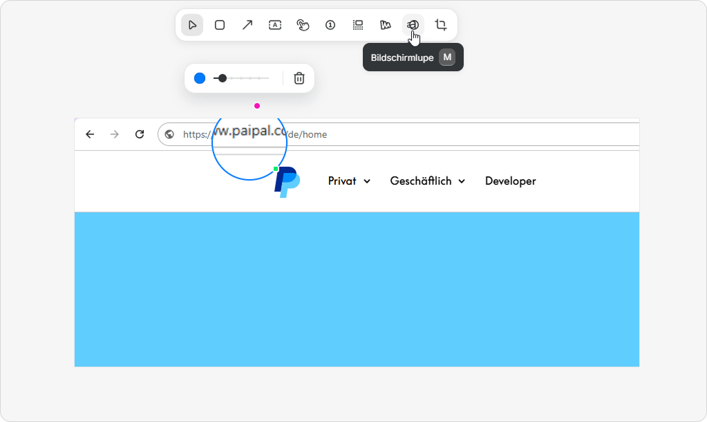 Die Bildschirmlupe eignet sich hervorragend, um kleine Elemente wie Schaltflächen oder URLs hervorzuheben, die Lernende leicht übersehen könnten.