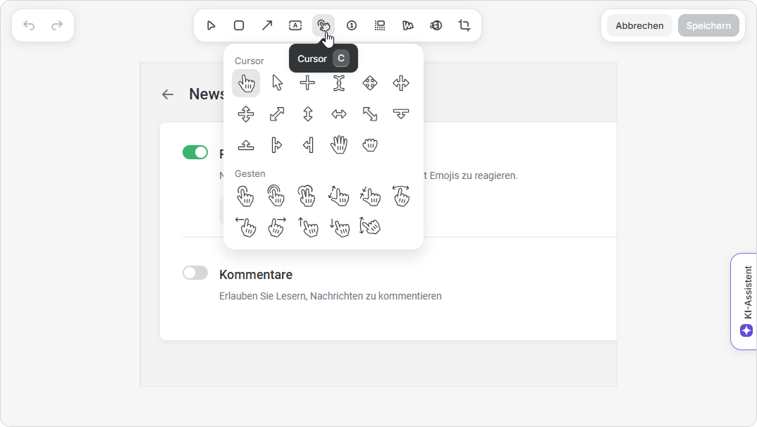 Sie können verschiedene Cursor- und Gestenstile wählen, um zu zeigen, wie Benutzer mit der Benutzeroberfläche interagieren.