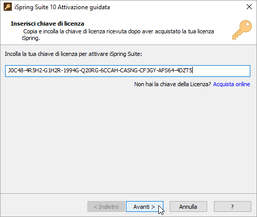 Dopo l’acquisto di iSpring Suite, ricevi un’e-mail con una chiave di licenza. Attiva la tua licenza tramite questa chiave.