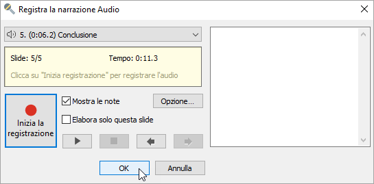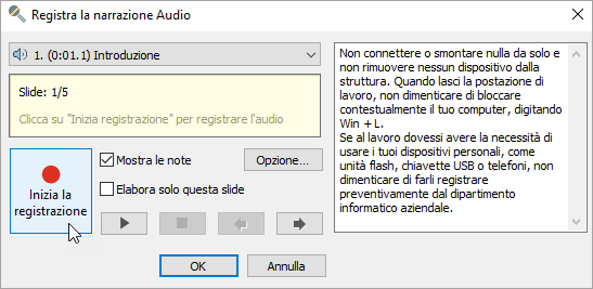 Registra una narrazione audio e sincronizzala con le diapositive della presentazione.