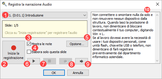 4. Elabora solo questa slide | Attiva e disattiva la registrazione audio solo per la diapositiva corrente. |
