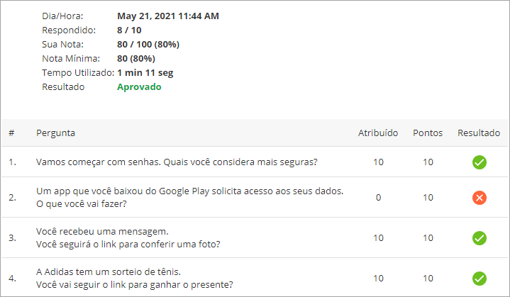 La versione breve del report include le informazioni base sui risultati dello studente come il tempo di completamento del quiz, il punteggio ottenuto e l’elenco delle domande.