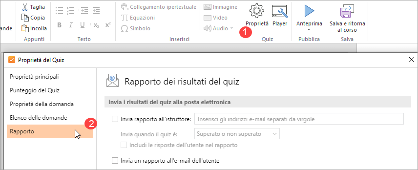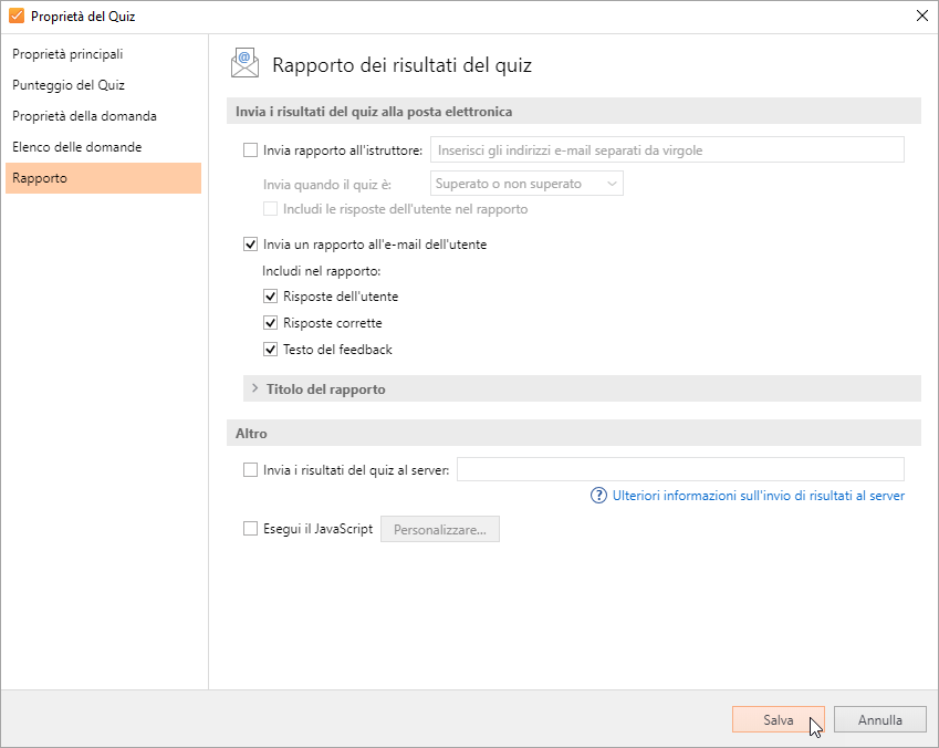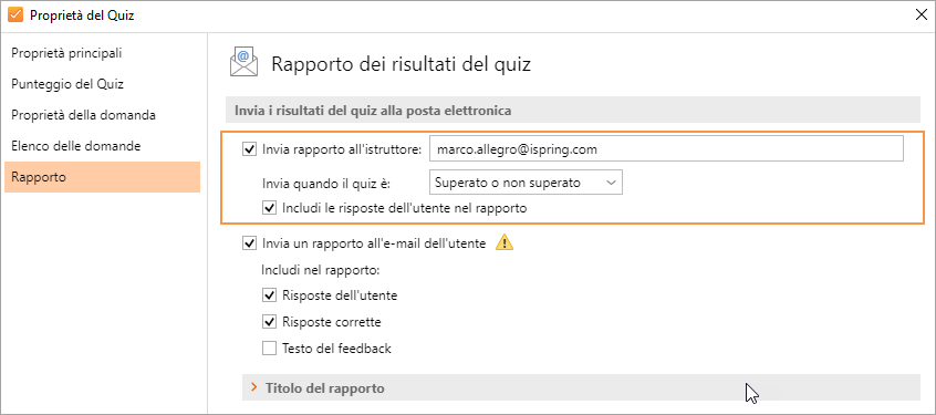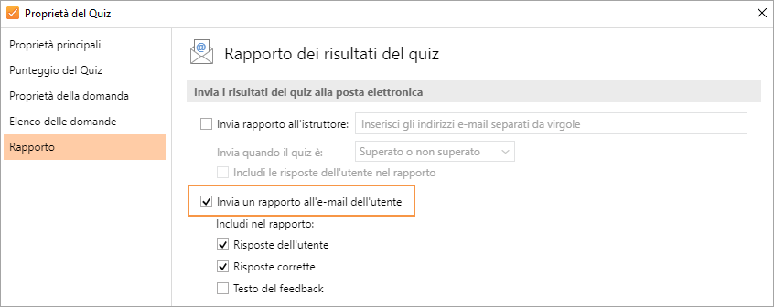 Puoi configurare le informazioni che saranno incluse nel report nella sezione Rapporto della Proprietà quiz.