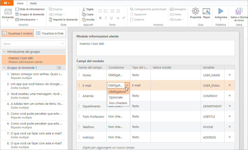 Questa diapositiva contiene dei campi che ti aiuteranno a raccogliere le informazioni personali degli utenti, come gli indirizzi e-mail, prima che inizino il quiz. Qui puoi selezionare quali campi aggiungere al modulo.