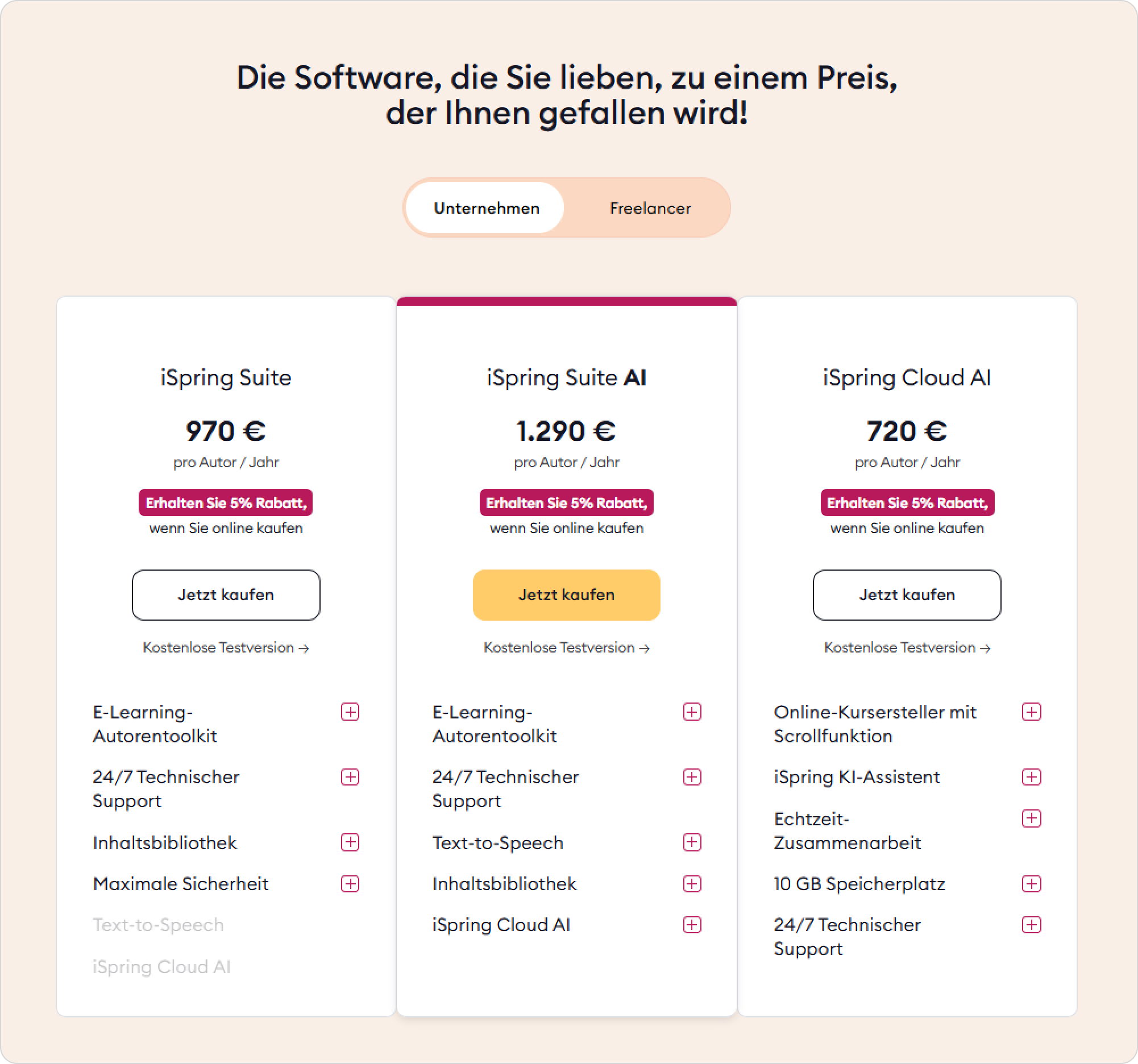 Um iSpring Suite AI zu erwerben, öffnen Sie die offizielle iSpring-Website und wählen Sie das iSpring Suite AI-Paket.