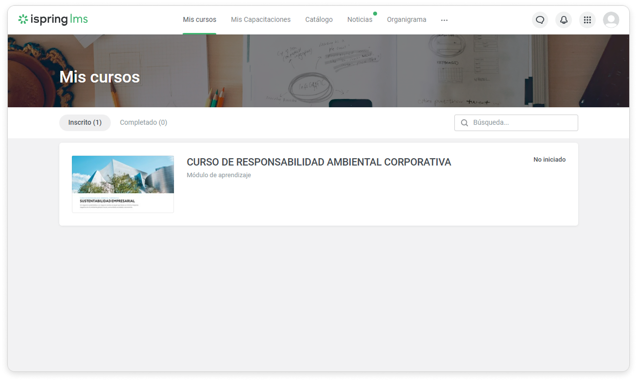 Después de hacer clic en el botón Registrarse, los alumnos verán la sección Mis cursos del portal del usuario. Allí podrán ver todos los cursos asignados (si se creó una regla de autoinscripción) y podrán empezar a estudiar.
