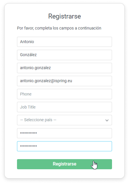 Puedes habilitar la Política de privacidad en tu cuenta de iSpring LMS. El usuario no podrá registrarse si no la acepta.
