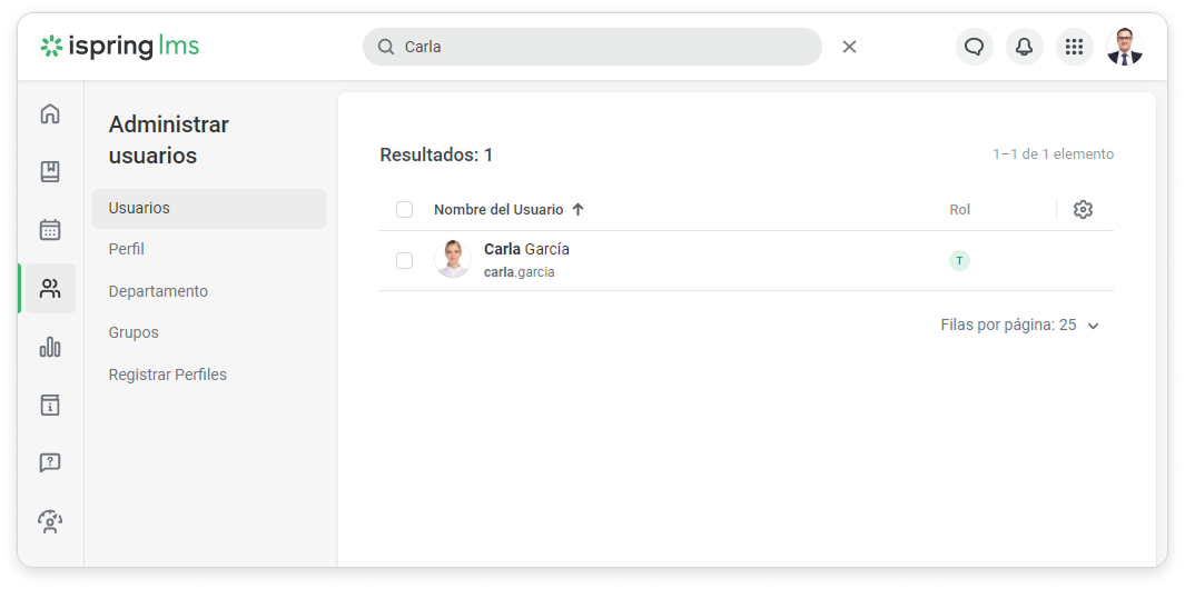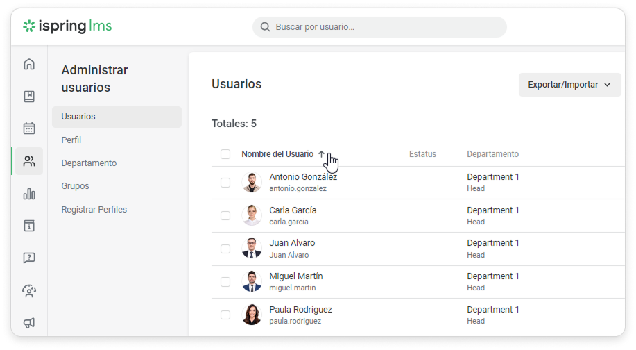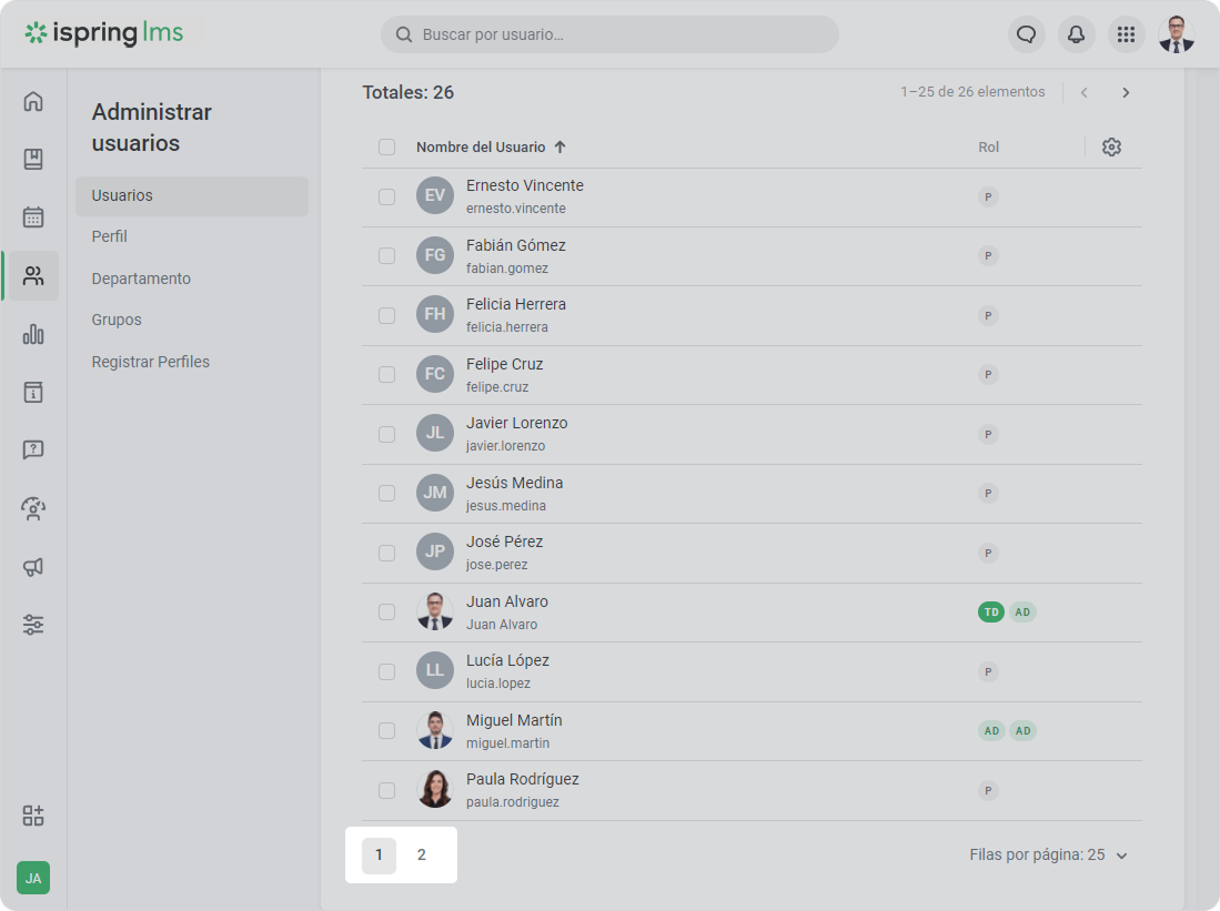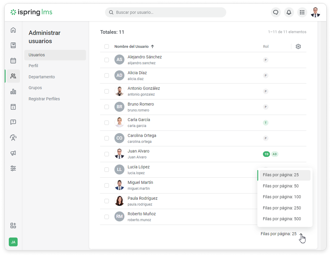Puedes navegar por la lista de usuarios de iSpring LMS de las siguientes maneras: