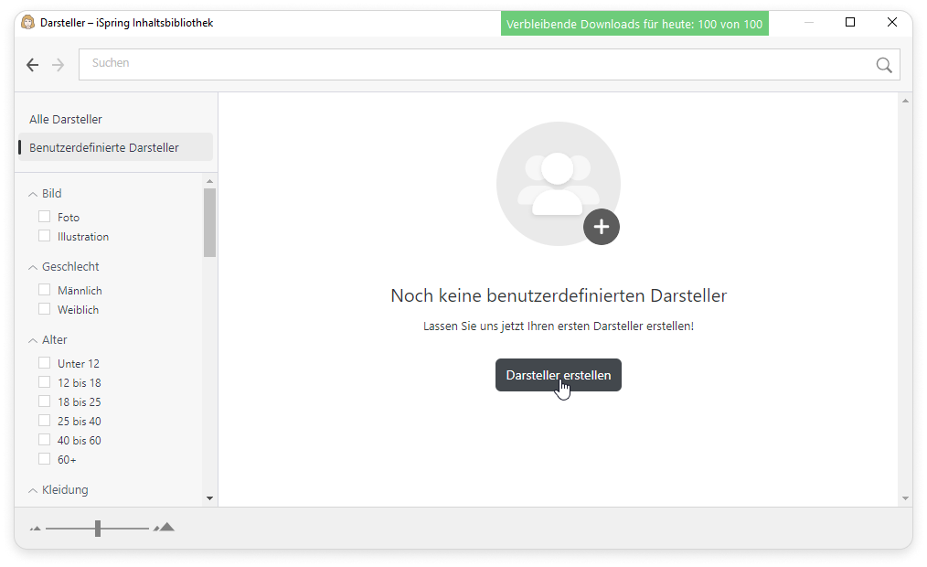 - Öffnen Sie die Inhaltsbibliothek und gehen Sie auf die Registerkarte Benutzerdefinierte Darsteller. Klicken Sie auf Darsteller erstellen.