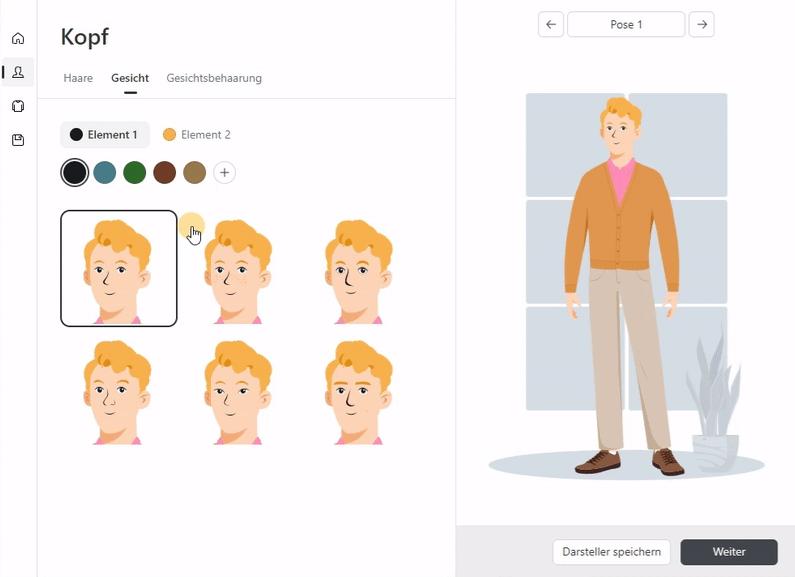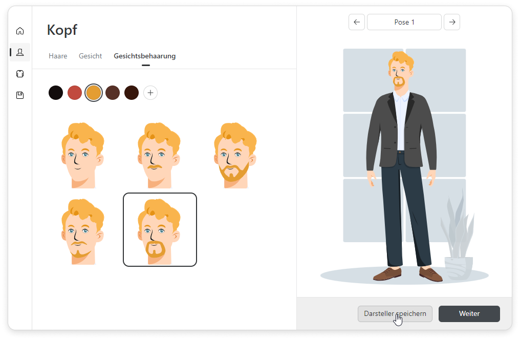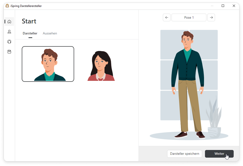 Fertig! Sie haben jetzt Ihrem Kurs Ihren eigenen benutzerdefinierten Darsteller hinzugefügt.Mit der Testversion der iSpring Suite können Sie einen einzelnen Darsteller erstellen. Melden Sie sich bei Ihrem Konto an, um sie zu speichern und zu Folien hinzuzufügen. Sie können nur die erste gelistete Pose auswählen.