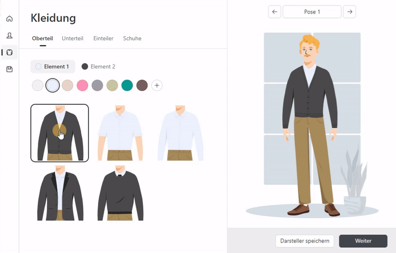- Wählen Sie auf der Registerkarte Kleidung die Ober- und Unterteile und die Schuhe für Ihren Darsteller aus. Sie können auch deren Farbe auswählen.