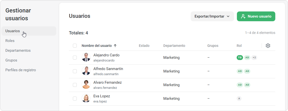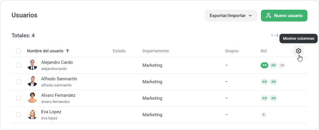 Puede personalizar qué información mostrar en la pantalla en la sección Usuarios. Deje solo las columnas necesarias y desactive las que no se necesitan. Esto hará que sea más fácil navegar por la lista de usuarios.