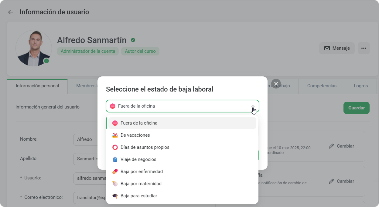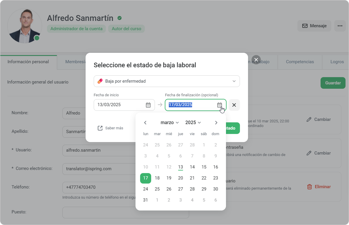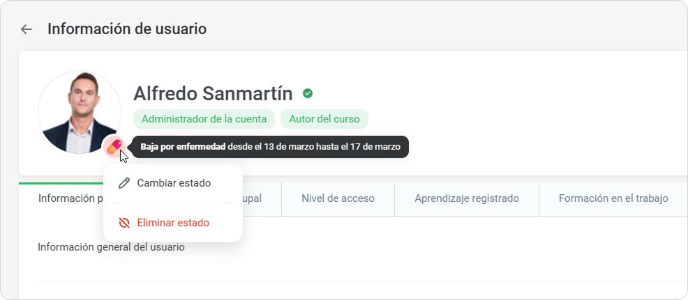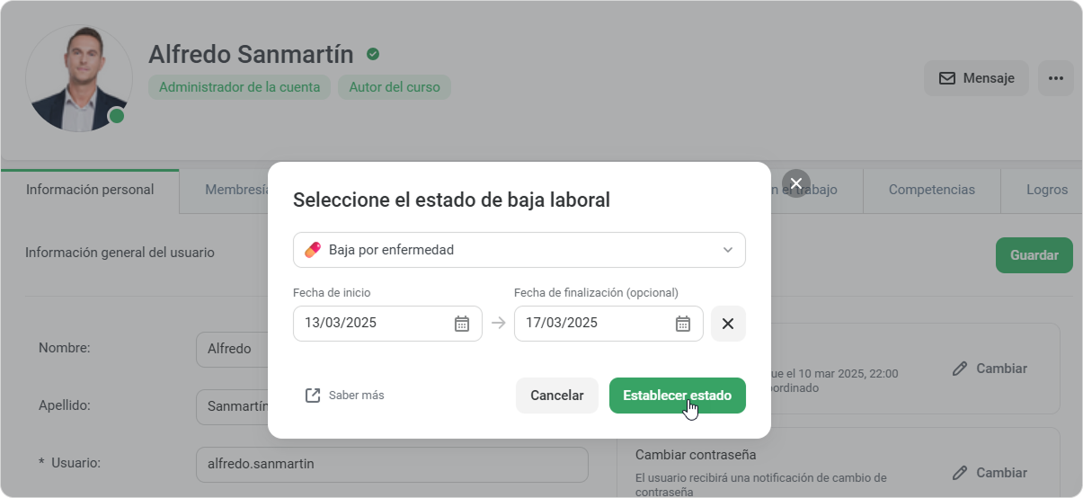 Puede cambiar y eliminar el estado de baja laboral de una persona.