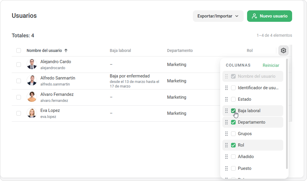 Puede añadir una columna de Baja laboral a la lista de usuarios para ver fácilmente el estado laboral de los empleados.