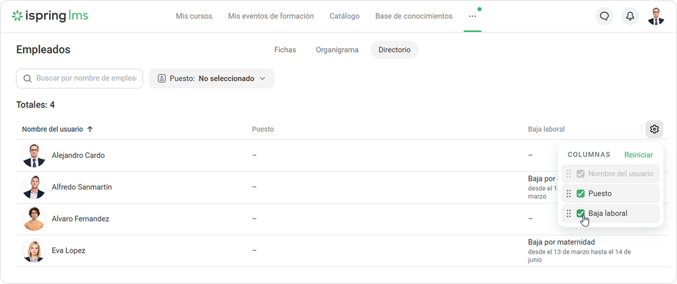 - Verá el filtro de Baja laboral. Seleccione el estado. Por ejemplo, puede ver qué compañeras están de baja por maternidad.