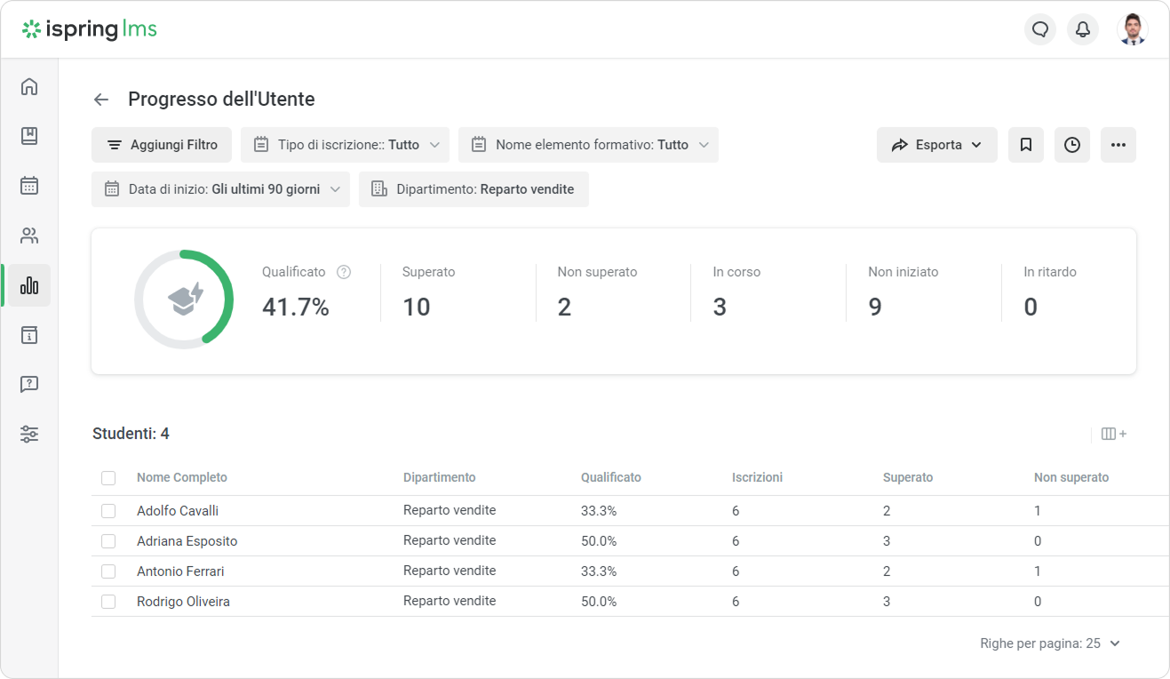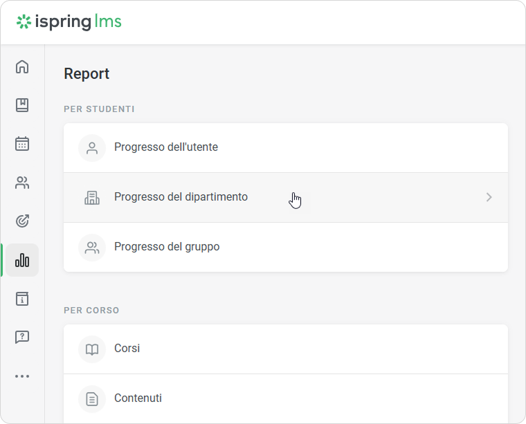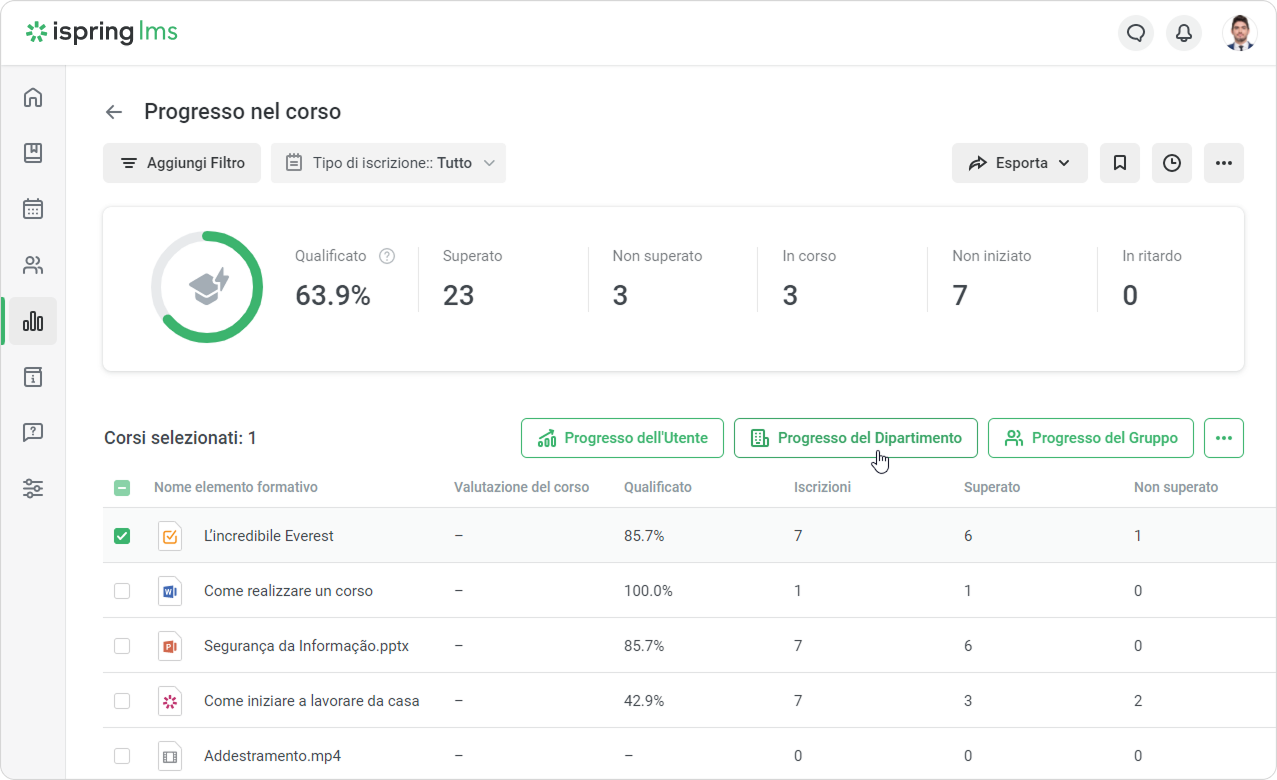 Questo tipo di report contiene i dati sulla formazione del dipartimento nel tuo account. Verifica quanti corsi sono stati assegnati al dipartimento, quali di questi sono stati superati e quali non sono stati ancora seguiti.