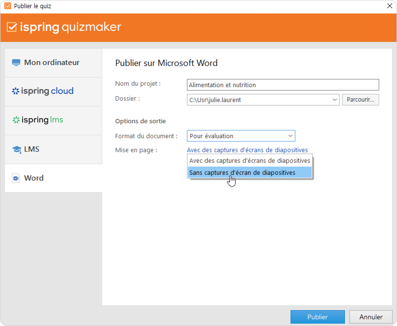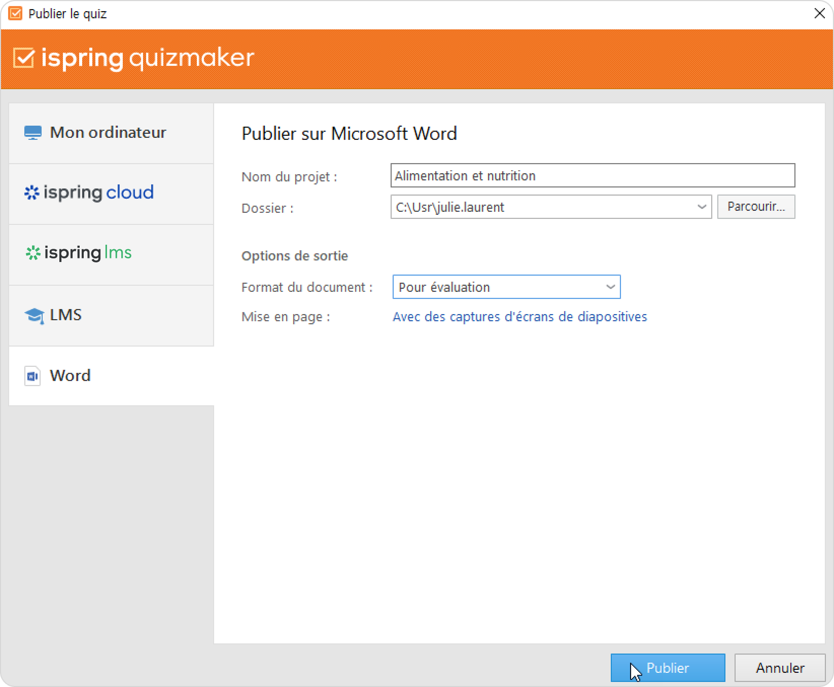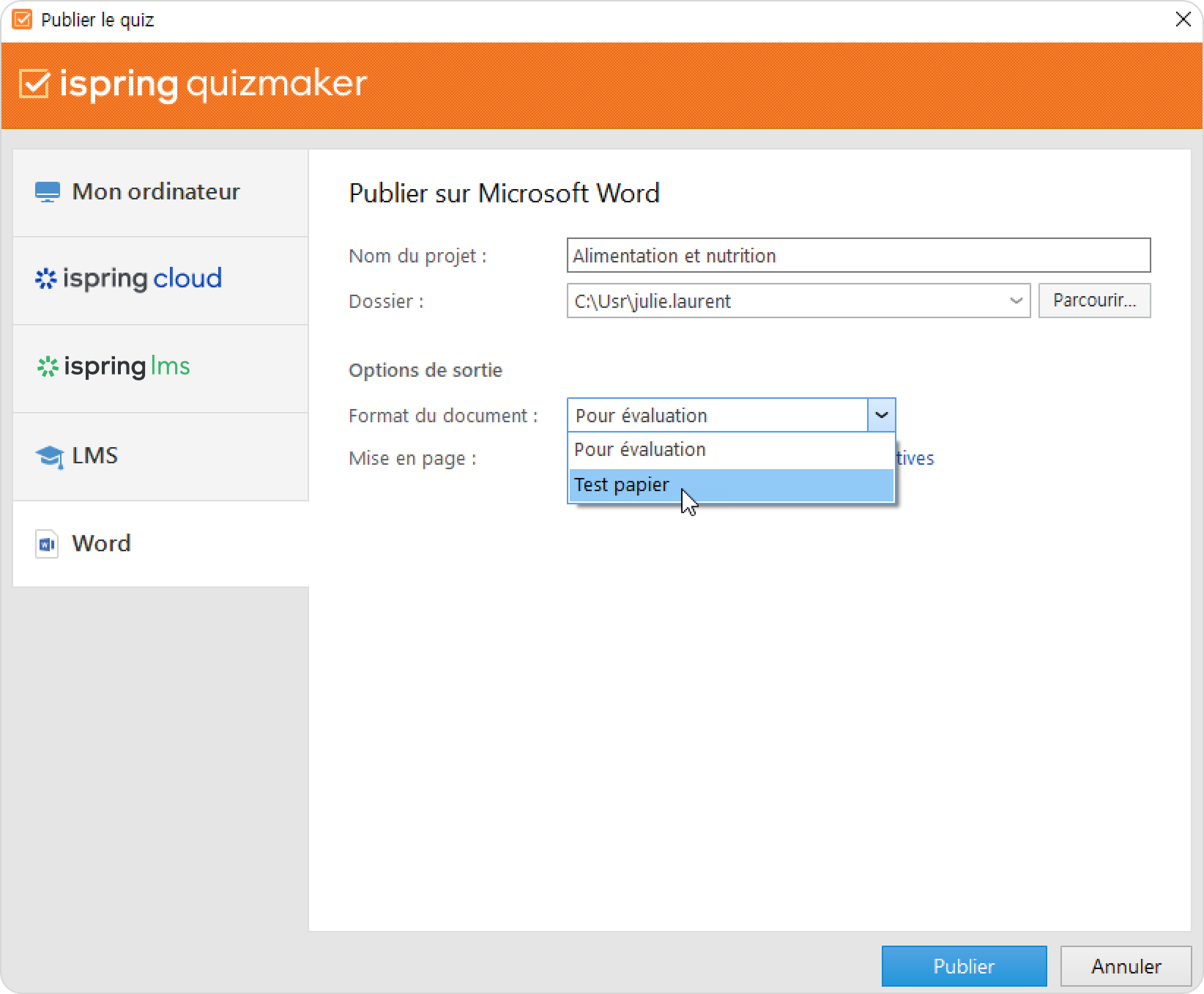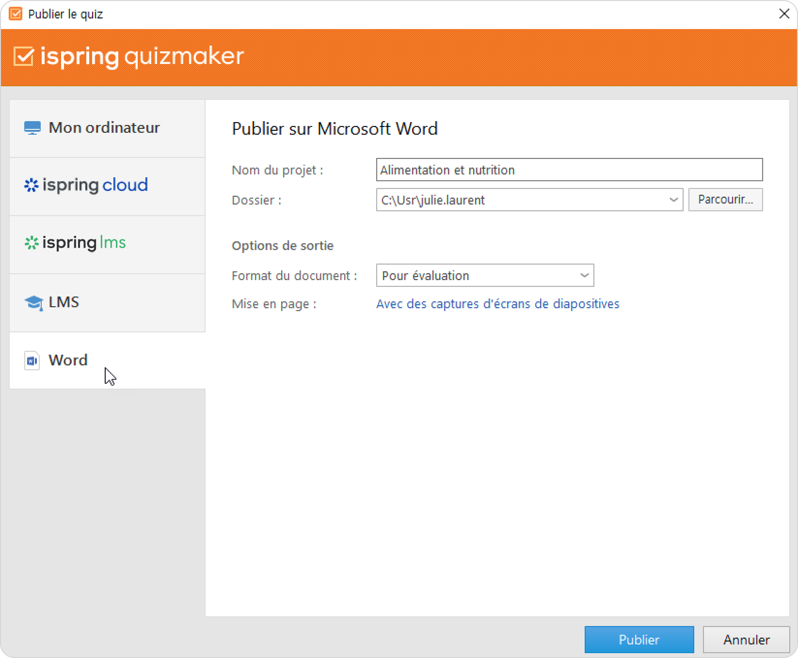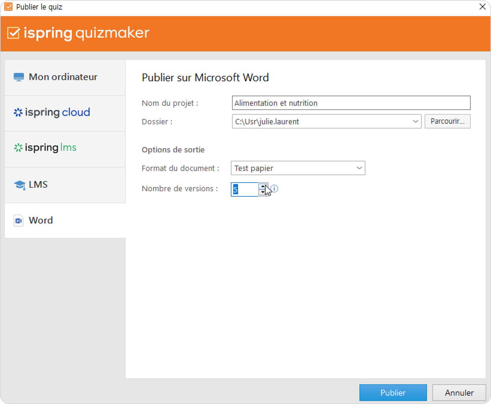 La publication au format Word vous permet d'enregistrer votre quiz au format doc. Vous obtiendrez ainsi un document Microsoft Word contenant toutes les questions, réponses et commentaires du quiz. Vous pourrez imprimer le fichier et l'utiliser comme support de formation pendant les cours ou l’uploader vers un stockage en cloud, un LMS ou un serveur FTP.