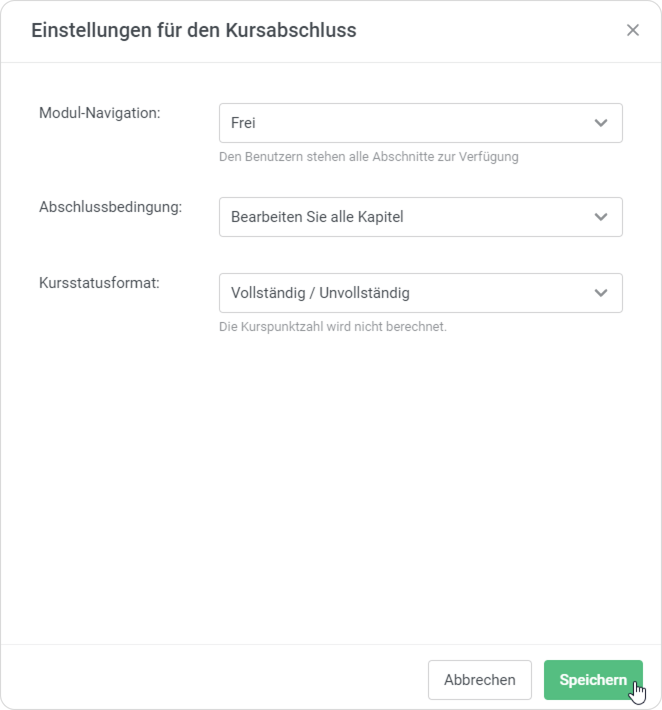 - Wählen Sie im Fenster Kursabschlusseinstellungen die gewünschten Einstellungen aus und klicken Sie auf Speichern.