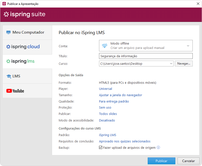 O iSpring Suite cria um pacote que está pronto para ser enviado para o iSpring LMS. Agora você pode entrar na sua conta iSpring LMS e enviar este pacote para um curso a qualquer momento. Para saber mais, leia as instruções detalhadas para enviar conteúdo através da interface web.