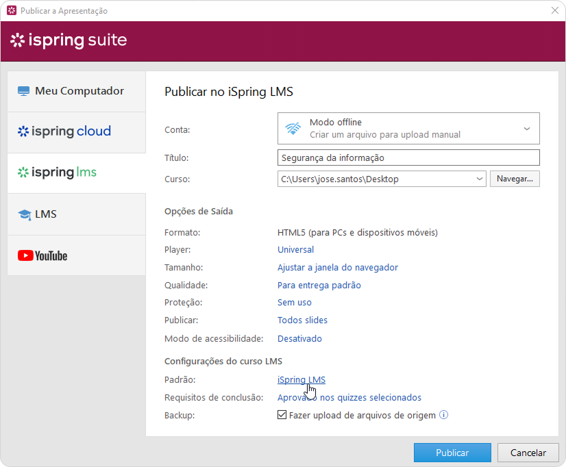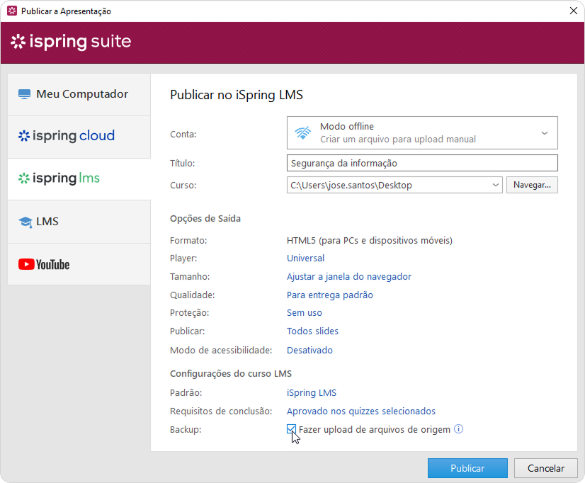 Se o seu computador estiver desconectado da Internet ou a publicação online não for concluída devido a um programa antivírus ou a um erro do servidor proxy, você poderá enviar a apresentação para o iSpring LMS manualmente.
