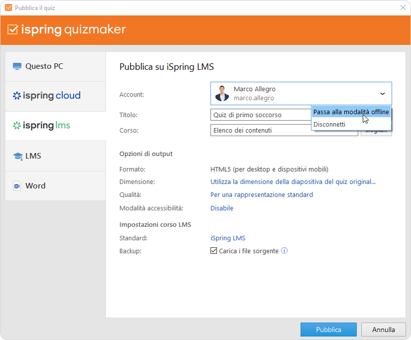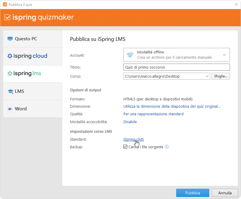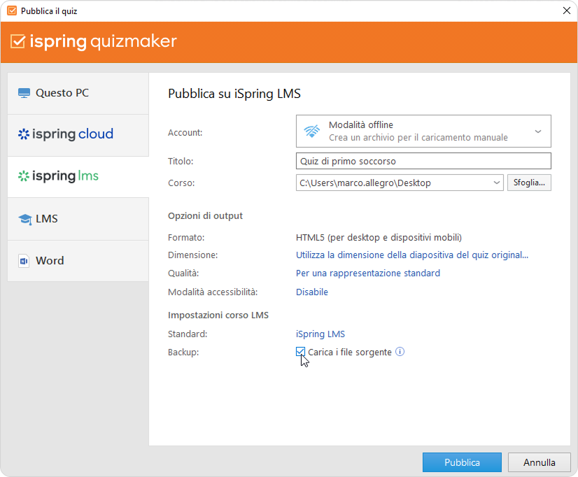 Se il tuo computer non è connesso a internet oppure se la pubblicazione online non può essere completata a causa di un programma antivirus o un errore del server proxy, puoi caricare il quiz su iSpring LMS manualmente.
