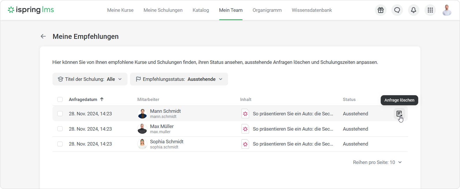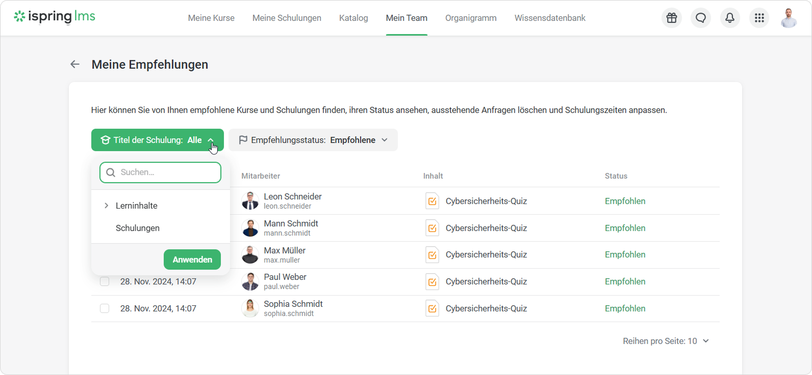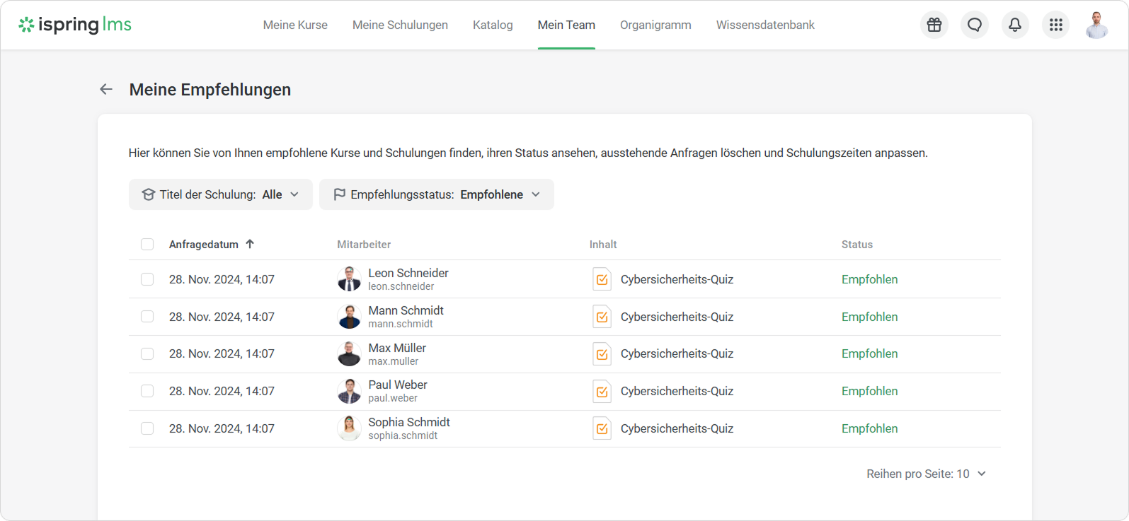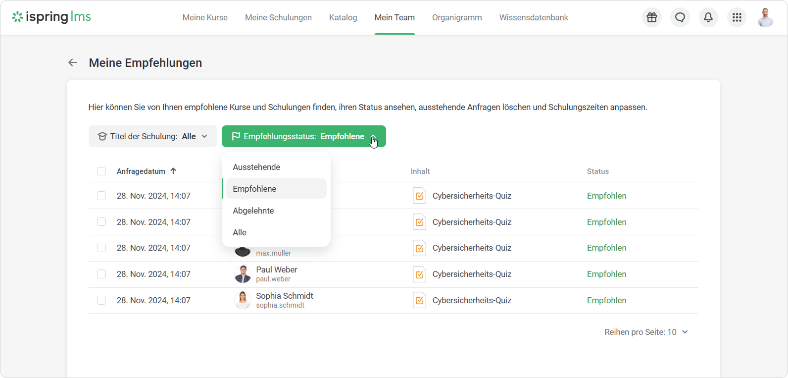 Im Abschnitt Mein Team können Vorgesetzte sehen, welche Kurse und Schulungen sie Mitarbeitern empfohlen haben. Ihre Anfragen zeigen automatisch den Status 'Empfohlen' an.