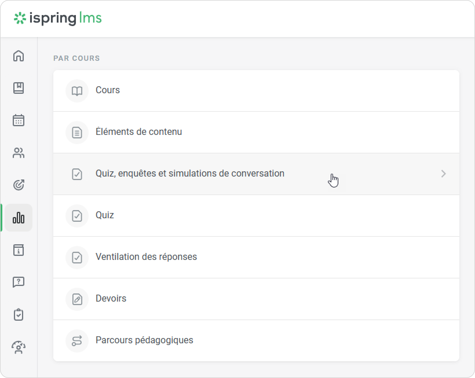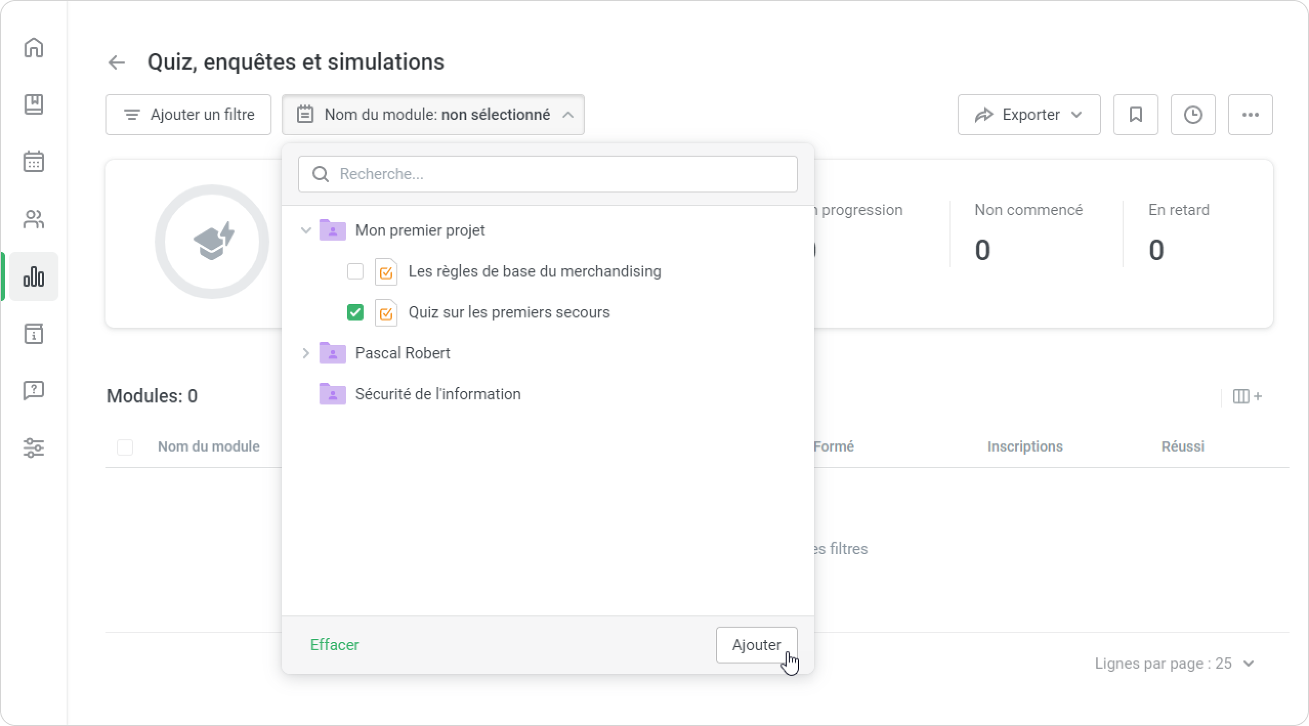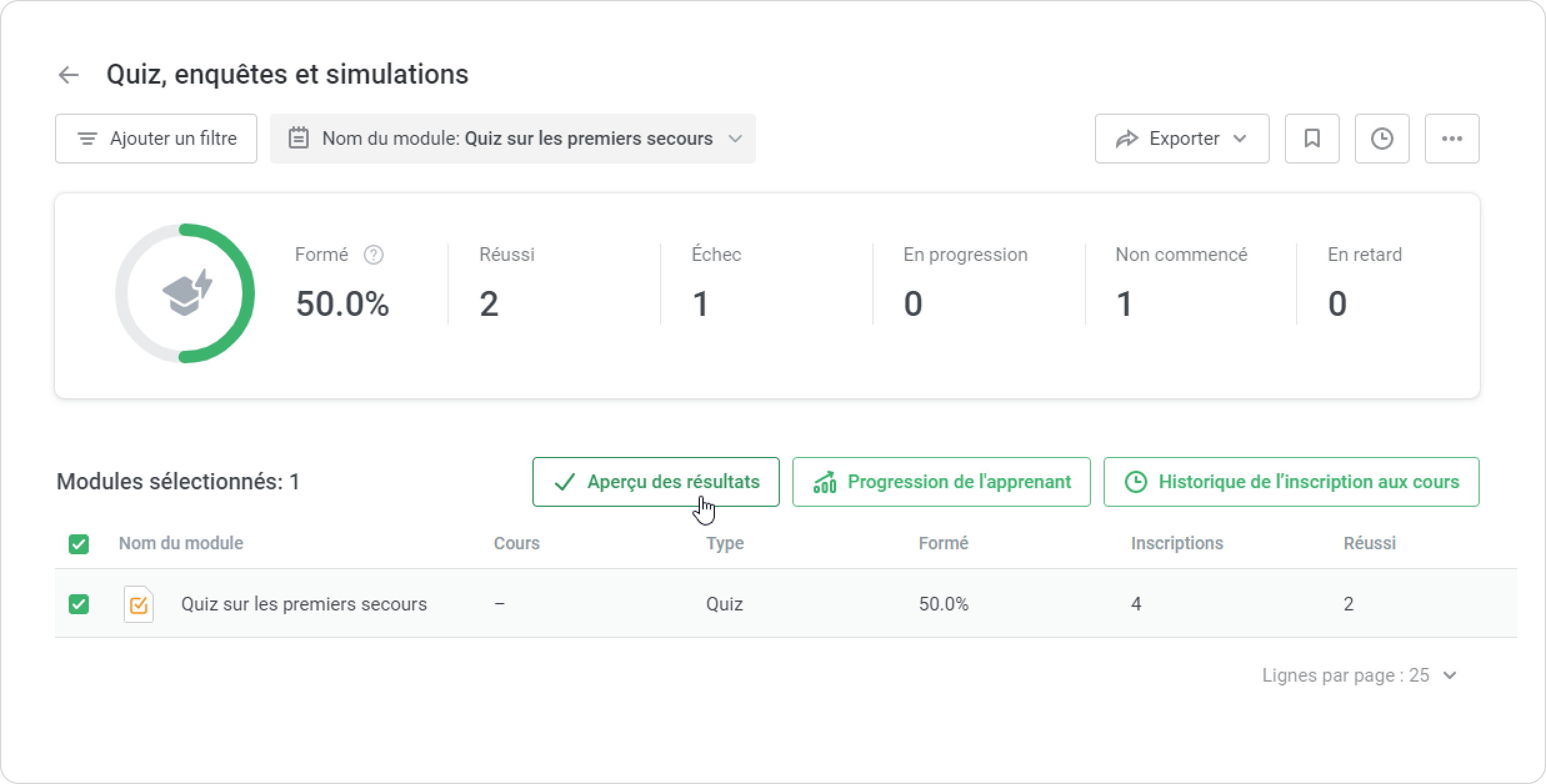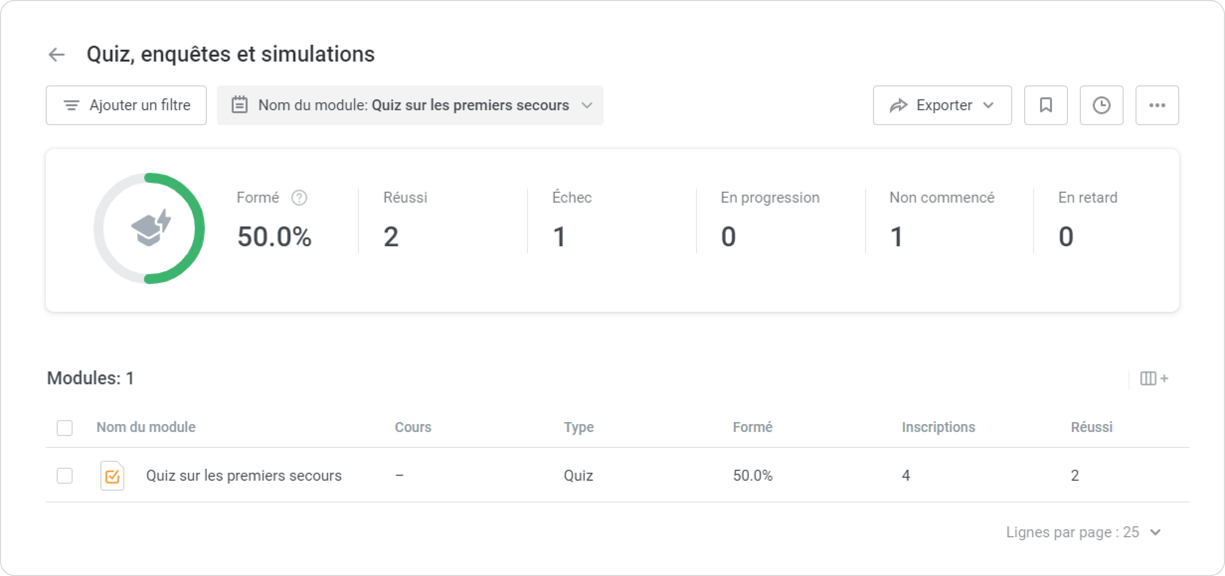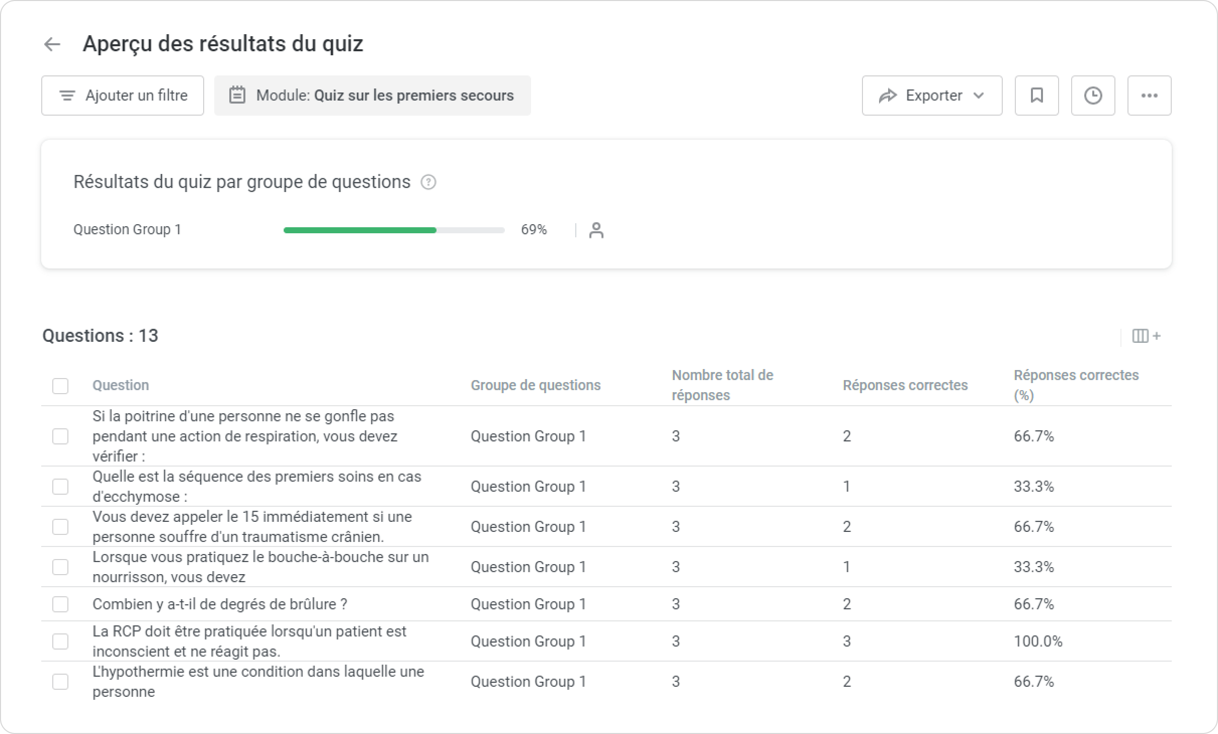 Les rapports sur les quiz, les enquêtes et les simulations permettront d'identifier les thèmes récurrents et de mieux organiser la formation. Créez un rapport sur les modules et accédez à des statistiques plus détaillées pour un groupe de questions du quiz :