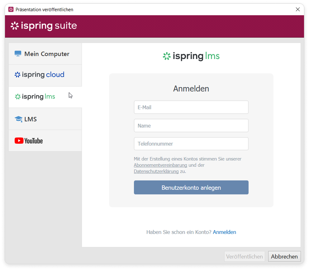 - Erstellen Sie direkt im Veröffentlichungsfenster ein neues kostenloses iSpring LMS-Konto. Geben Sie Ihre E-Mail-Adresse, Ihren Namen und Ihre Telefonnummer ein und klicken Sie auf Benutzerkonto anlegen. Sie erhalten eine E-Mail mit Ihren Anmeldedaten.