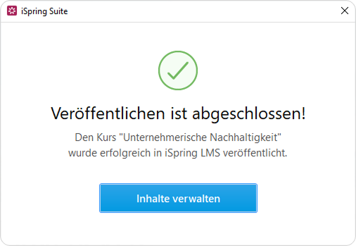 Wenn der Veröffentlichungsprozess erfolgreich abgeschlossen wurde, wird ein neues Fenster geöffnet. Klicken Sie auf Inhalt verwalten, um die veröffentlichte Präsentation in der iSpring LMS-Oberfläche zu öffnen. - Die Präsentation, die einem Kurs hinzugefügt wurde, wird in Ihrem iSpring LMS-Konto angezeigt.